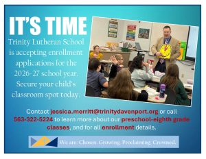 Trinity Lutheran will be opening its enrollment process for the 2026-27 school year in the coming weeks. If you would like more information about Trinity